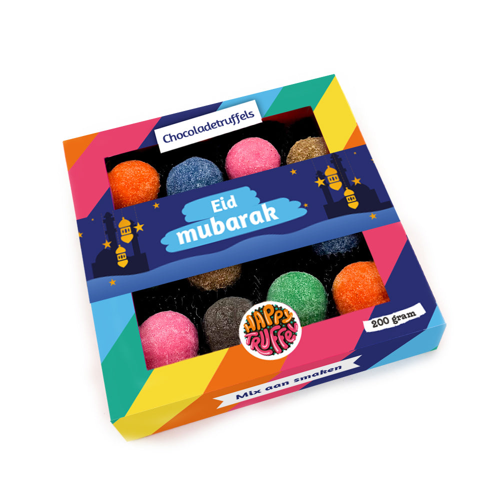 Vier het feest van Eid met de Chocoladetruffels Mix Eid Mubarak, een luxe doos met 12 ambachtelijke truffels. Elke truffel is met zorg gemaakt van hoogwaardige chocolade en biedt een zachte, romige vulling die smelt op de tong. Deze bijzondere selectie combineert verfijnde smaken in een prachtig geschenk dat zowel traditioneel als feestelijk aanvoelt.